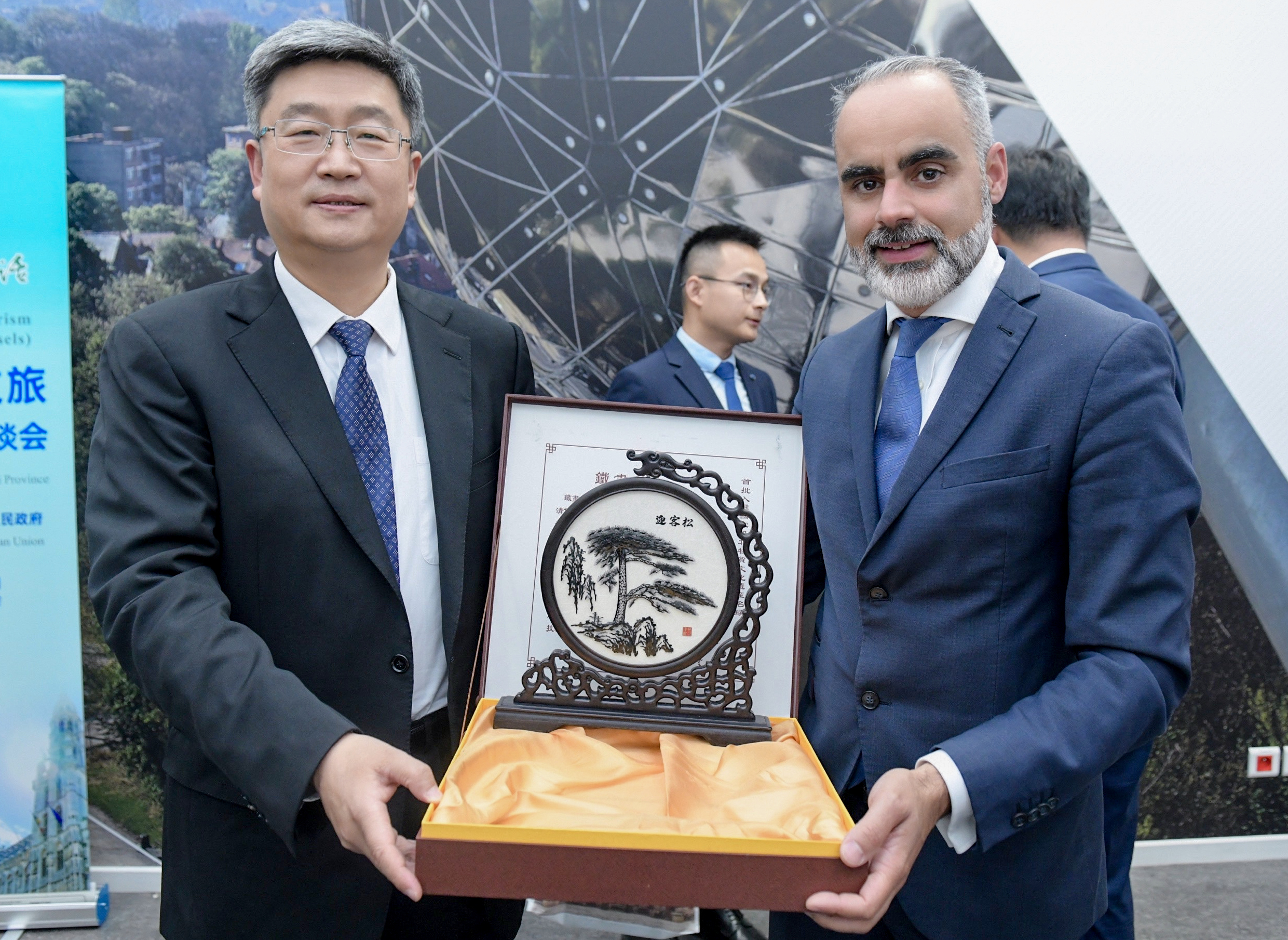 在安徽省人民政府副秘書長汪春明先生的主持下,活動正式拉開帷幕。安徽省人民政府副省長孫勇先生首先致辭,他深情地介紹了安徽悠久的歷史、秀美的山川和豐富的旅游資源,并誠摯邀請比利時及歐洲的朋友親臨安徽,感受“徽風(fēng)皖韻”的獨特魅力。中國駐比利時使館代表、瓦隆大區(qū)代表及歐洲旅游委員會代表也紛紛致辭,對安徽文旅資源的豐富性和多樣性給予了高度評價,并表達了加強合作、共謀發(fā)展的美好愿景。